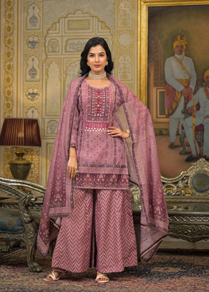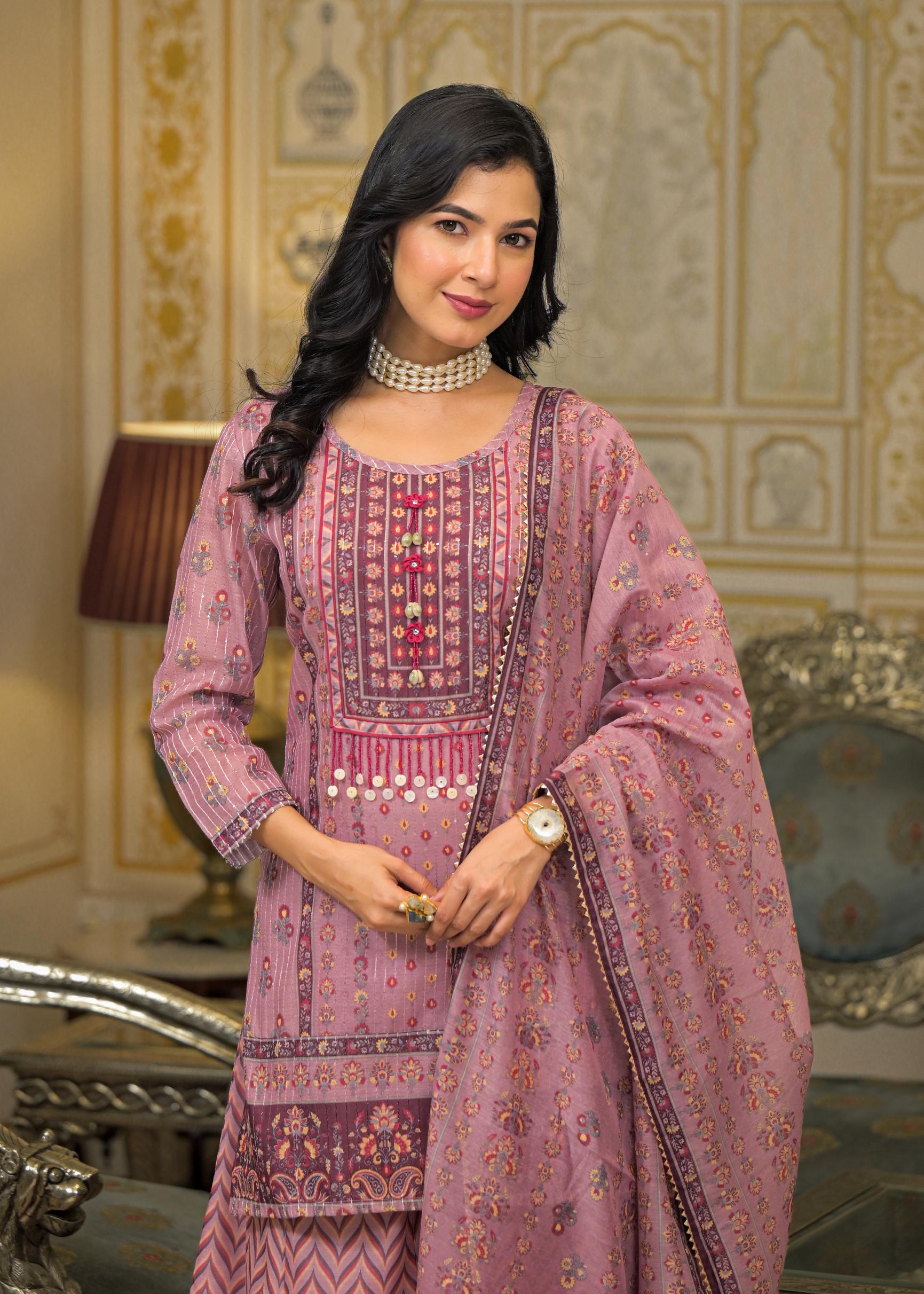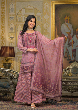 Pink Floral Printed Embroidered Straight Kurta & Palazzo with Dupatta
