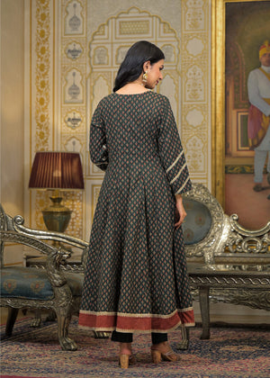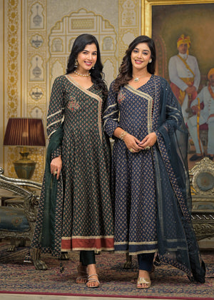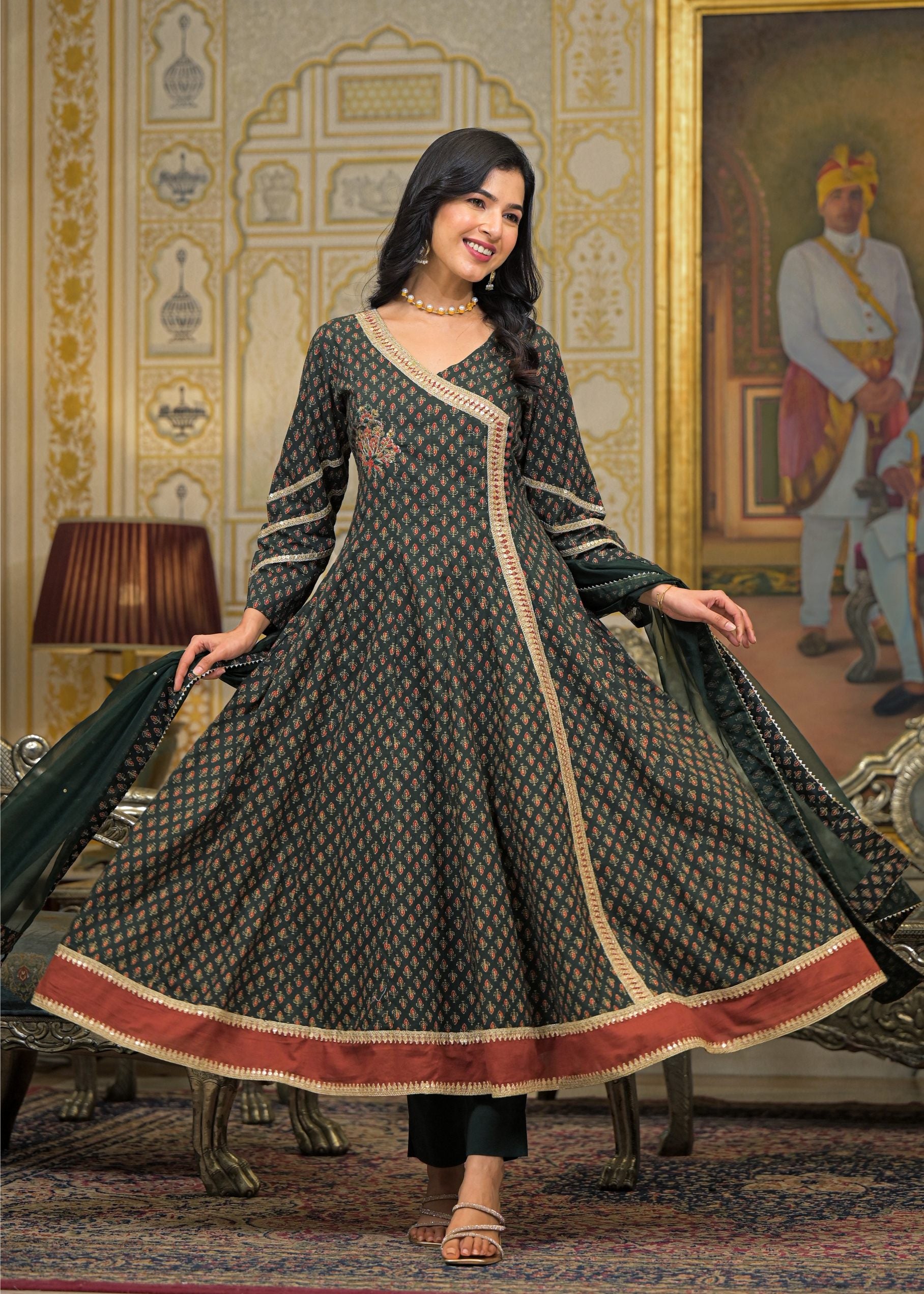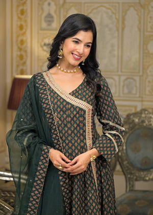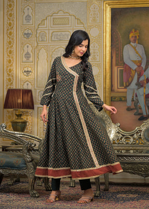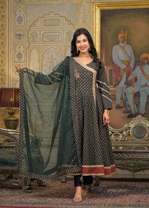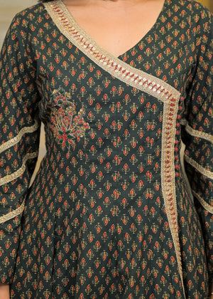 Green Cotton Angrakha Anarkali V-Neck Zari Kurta and Trouser with Duaptta